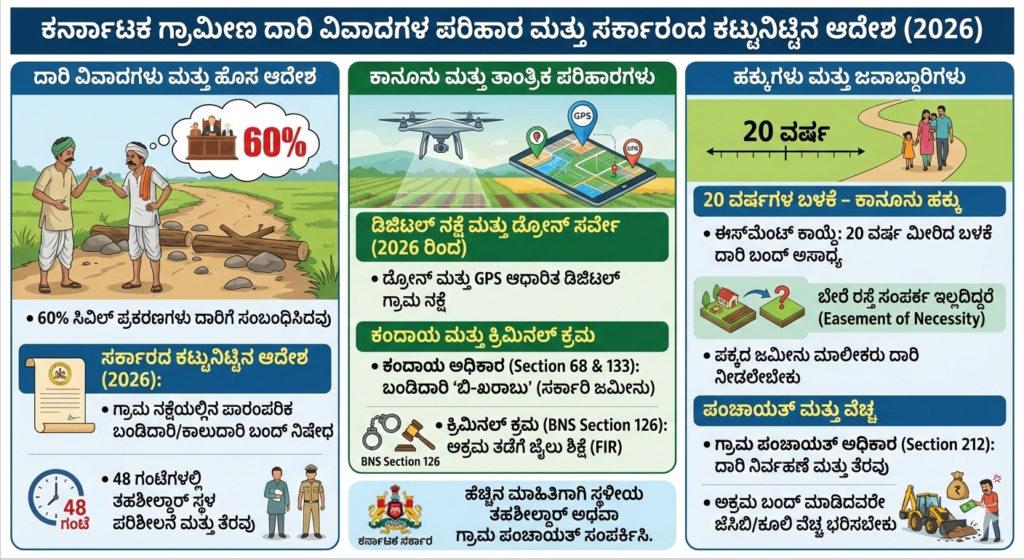 * “ಸರ್ಕಾರವು 2026 ನೇ ಆದೇಶದಲ್ಲಿ ಹಳೆಯ ಕಾಲುದಾರಿ ಅಥವಾ ಬಂಡಿ ದಾರಿಗಳನ್ನ ಯಾರೊಬ್ಬ ರೈತರು ಮುಚ್ಚುವಂತಿಲ್ಲ ಮತ್ತು ತಾಸಿಲ್ದಾರ್ ಅವರು ಇಂತಹ ದೂರನ್ನು ಆದ್ಯತೆಯ ಮೇಲೆ ಬಗೆಹರಿಸಬೇಕು ಎಂದು ಸರ್ಕಾರ ಖಡಕ್ಕಾಗಿ ಈ ಬಾರಿ ಸೂಚನೆಯನ್ನು ನೀಡಿದೆ”.